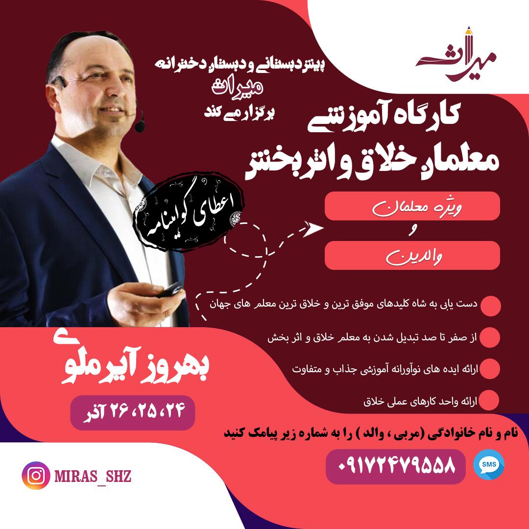کارگاه آموزشی معلم خلاق و اثر بخش با حضور جناب آقای دکتر بهروز آیرملوی به صورت یک کارگاه 16 ساعته در روز های پنجشنبه و جمعه مورخ 24 و 25 آذر ماه 1401 برای معلمان علاقه مند برگزار می گردد. و همچنین در روز شنبه بعدازظهر مورخ 26 آذر ماه کارگاه آموزشی برای والدین عزیز برگزار خواهد شد . جهت ثبت نام و کسب اطلاعات بیشتر به شماره 09172479558 خانم حسینی پیام دهید.